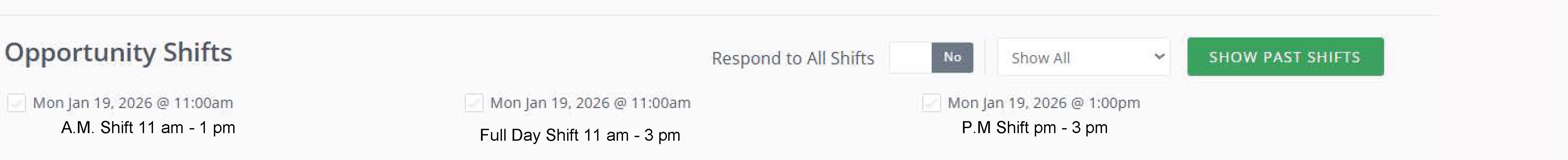 Individual Sign ups: Unfortunately we have no control over how Galaxy displays the shifts. We have provided a snapshot with notes to help you differentiate between the a.m. and full day shifts.